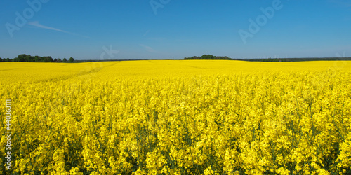 Fototapeta premium Blooming rapeseed field and blue sky.