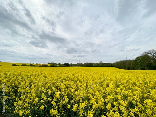 Fototapeta premium Blooming rapeseed field in a cloudy day, bright vibrant colours in England, Spring, season