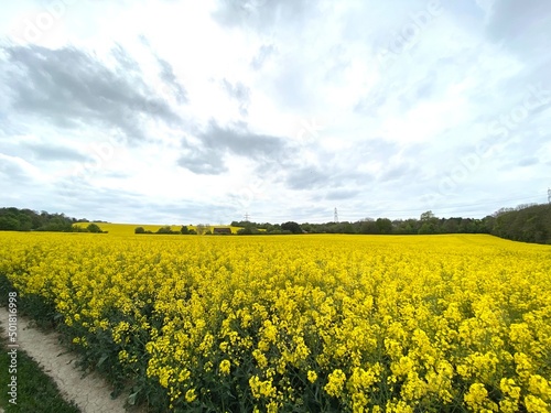 Fototapeta premium Blooming rapeseed field in a cloudy day, bright vibrant colours in England, Spring, season