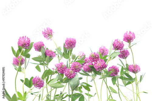 © vaitekune, Naklejka premium Blooming Red Clovers isolated on white background. Meadow wild plants Trifolium pratense.