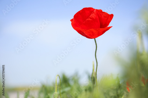 Naklejka premium Blooming red poppy flower outdoors on spring day, closeup