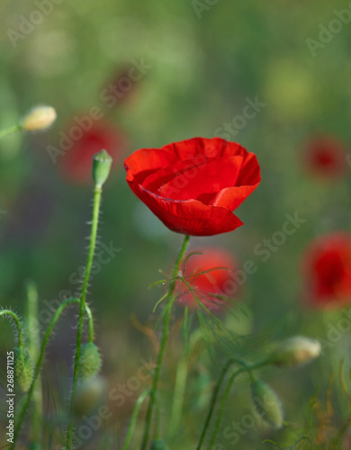 © nndanko, Naklejka premium blooming red poppy in the field in the spring afternoon