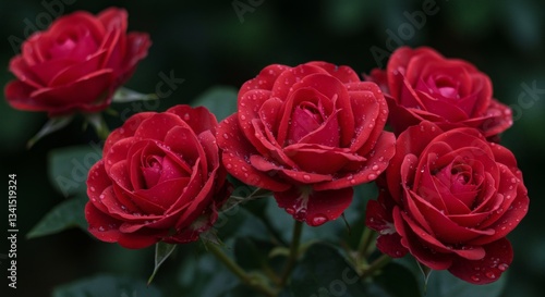 © CahyaSeptia, Obraz premium Blooming Red Roses with Water Droplets in a Lush Garden Setting