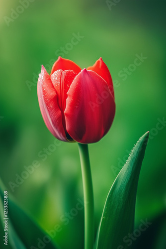 © Alex, Fototapeta premium Blooming red tulip with green background