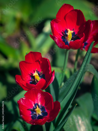 © KawaiiS, Fototapeta premium Blooming red tulips in spring flowerbed low key background. Field of bright pink beautiful blooming flowers closeup in sunlight. Natural floral blossom wallpaper banner dark and moody minimal style.