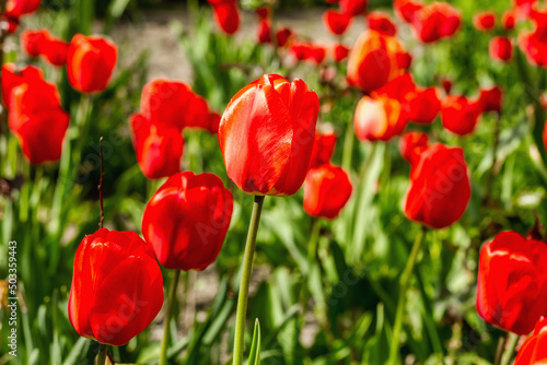Obraz premium Blooming red tulips in the garden. Spring seasonal of growing plants. Gardening concept background