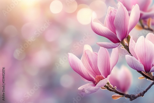 Obraz premium Blooming soft pink magnolia flowers creating a serene spring atmosphere, Soft...