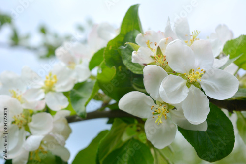 Obraz premium Blooming spring branches with green leaves and white flowers. Elegant gentle...