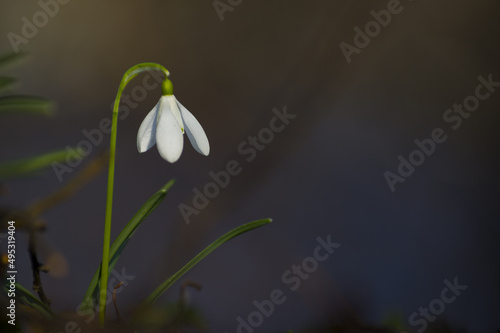 Fototapeta premium Blooming spring snowdrops in the forest in golden hour
