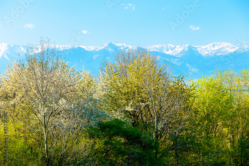 Naklejka premium Blooming spring tree and snow mountains in the background.