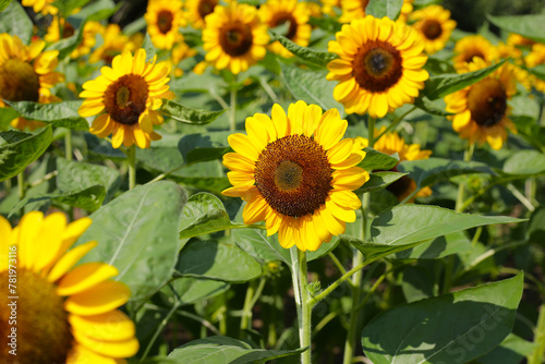 Fototapeta premium Blooming sunflower fields. Beautiful yellow flower