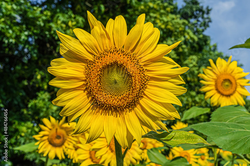 Fototapeta premium Blooming sunflower on field in summer