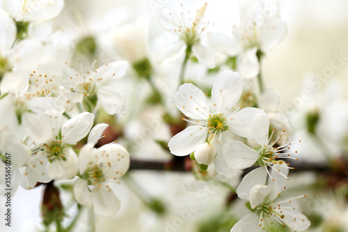 © Kindarts, Fototapeta premium Blooming tree branch with cherry white flowers. Seasonal spring floral background, close up view