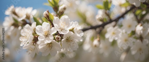 © DEER FLUFFY, Obraz premium Blooming tree branch with white flowers close up in a sunny day Spring nature concept Selective focus.