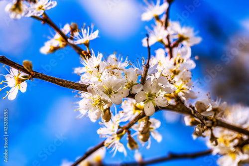 Fototapeta premium Blooming tree branches in spring with white flowers close up. Beautiful spring time