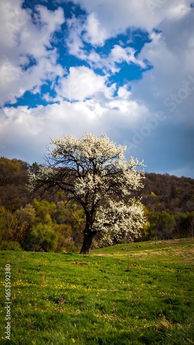 © Burhan, Fototapeta premium Blooming tree in a grassy field under a cloudy sky