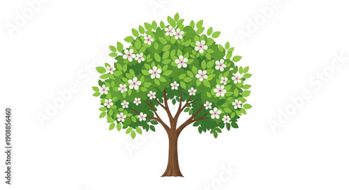 © Hanan, Fototapeta premium Blooming tree with green leaves and white flowers on white background