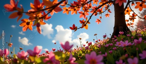 Fototapeta premium Blooming tree with pink flowers blooming below