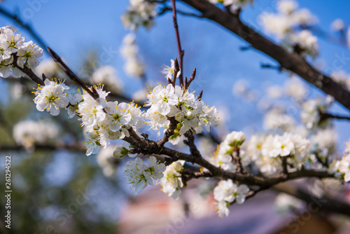 © vbaleha, Obraz premium Blooming tree with white flowers in spring. Springtime