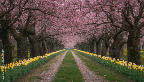 Naklejka premium Blooming Tulip Pathway Under Pink Cherry Blossoms Canopy