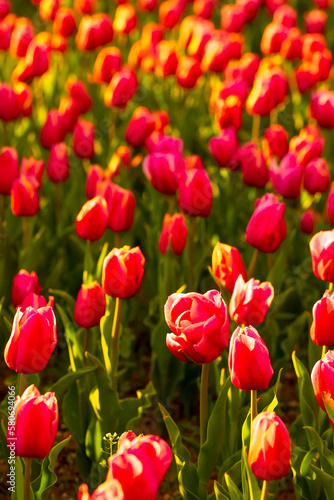 Fototapeta premium Blooming tulips. Spring floral background. Field of bright beautiful tulips...