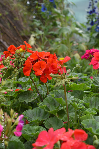 Fototapeta premium Blooming vibrant red geranium Pelargonium flowers closeup, Blooming of Geranium, closeup shot of red geranium flowers in garden, geranium in the exhibition of geraniums in Chakwal, Punjab, Pakistan