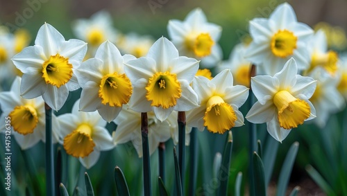 Fototapeta premium Blooming white and yellow daffodils adorn a garden