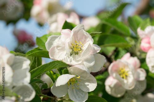 © elenae333, Fototapeta premium Blooming white apple tree in the spring garden.