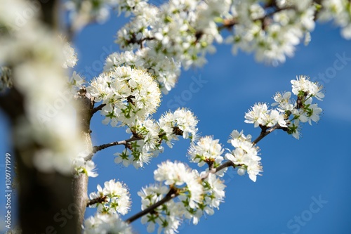 © Kokhan O, Fototapeta premium Blooming white flowers against a clear blue sky in springtime nature scene. Plum blossom