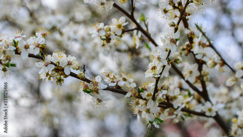 Fototapeta premium Blooming white flowers cherry plum tree in April.