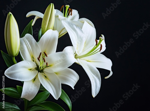 Fototapeta premium Blooming White Lily Flowers with Green Buds on Dark Background Still Life