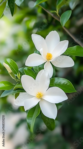 © Zulfa, Fototapeta premium Blooming White Magnolia Flowers in Garden, Nature Background, Botanical Print.