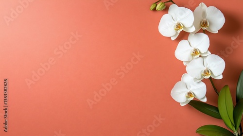 © ngamaz, Fototapeta premium Blooming white orchid flowers against a warm coral background