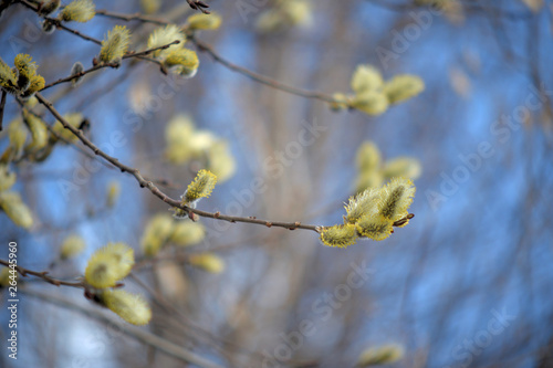 © Константин Занятных, Fototapeta premium Blooming willow with yellow chickens on the branches