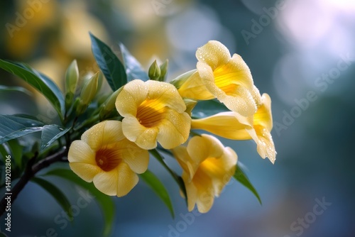 © El Media, Obraz premium Blooming Yellow Allamanda Flower with Water Droplets in Soft Sunlight