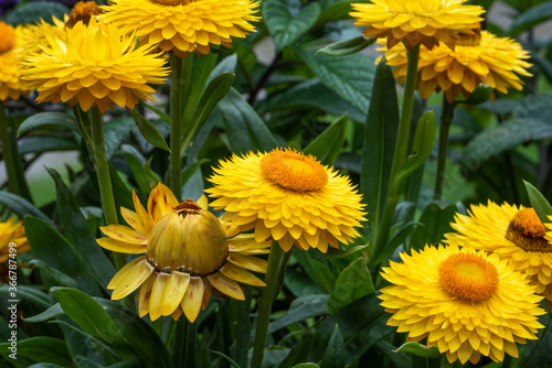© salita2010, Naklejka premium Blooming yellow everlasting flower in garden close-up