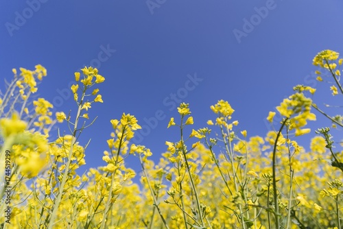 Obraz premium Blooming Yellow Rapeseed Flowers Under a Vivid Blue Sky in Spring Sunlight