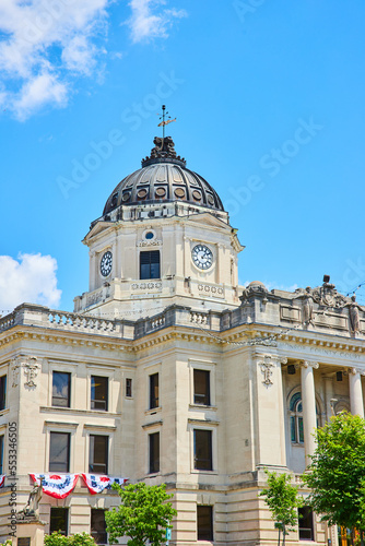 © Nicholas J. Klein, Obraz premium Bloomington Indiana courthouse in summer with red, white, and blue colors