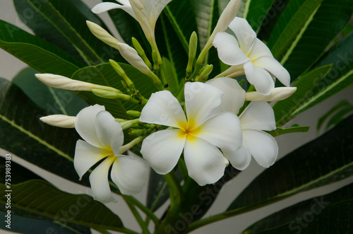 © athapet, Fototapeta premium Blooms and buds of frangipani flowers