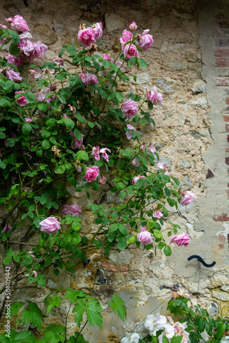 Naklejka premium Blossom of fragrant colorful roses on narrow streets of small village Gerberoy, Normandy, France