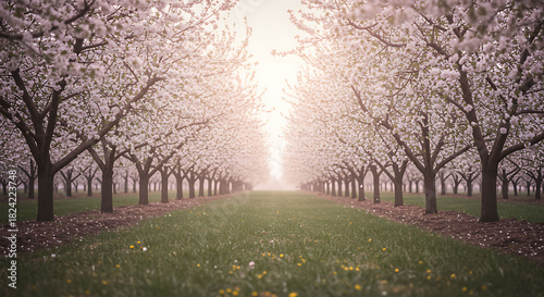 © SmartDesignStock, Naklejka premium Blossom Orchard in Spring trees row path grass nature landscape blooming white flowers