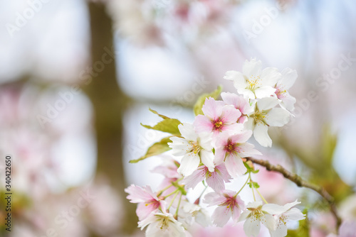 © tommoh29, Fototapeta premium Blossom tree with pink flower petals on natural blue sky background