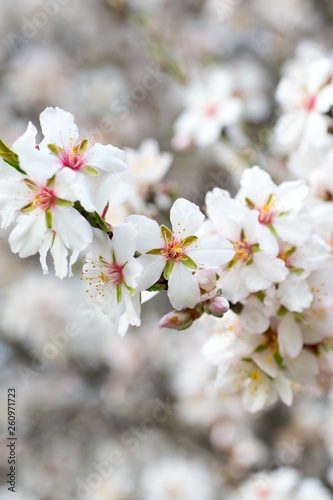 © darkfreya, Obraz premium Blossoming almond tree branches, the background blurred.