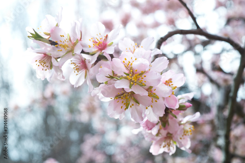 © darkfreya, Obraz premium Blossoming almond tree branches, the background blurred.