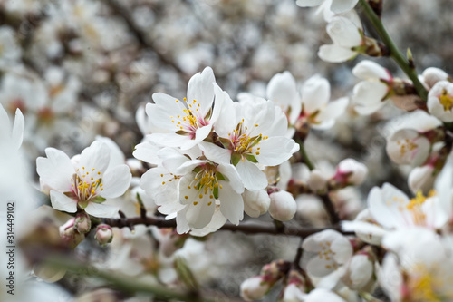 © darkfreya, Obraz premium Blossoming almond tree branches, the background blurred.