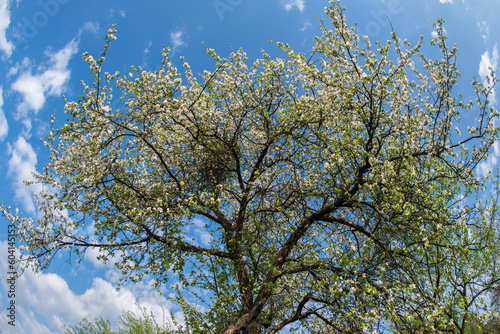 © baxys, Obraz premium Blossoming apple tree against the blue sky.