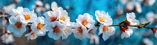 © Thamonchanok, Obraz premium Blossoming apricot tree branches against sunlight and peaceful sky concept. Beautiful blooming cherry blossom branch against a vibrant background.