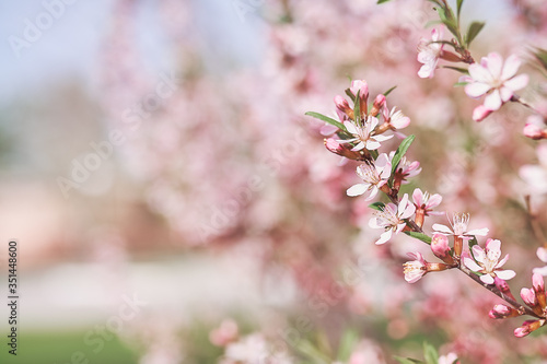 Fototapeta premium Blossoming branch pink almond tree. Bright colorful spring flowers. Bright...