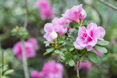 Fototapeta premium Blossoming camellia flowers, with delicate purple flowers
