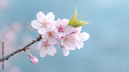 Obraz premium Blossoming cherry branch against soft blue sky. Possible use Springtime beauty, nature background, desktop wallpaper